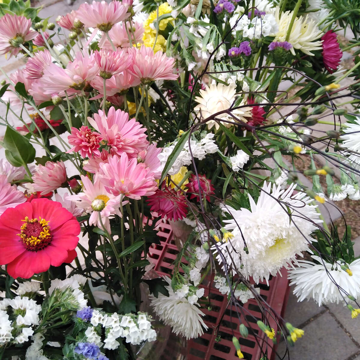 Осень сезона 2022г. холодная и промозглая. Моросящие дожди и совсем невысокая температура. За сутки погода изменилась от плюс 30 с лишним до плюс 14... Нам резко выключили лето и включили осень. Застала нас врасплох такая погода. Многое не упеваем... Стройку решили отложить на следующий год и заняться вплотную огородними делами. Ведь огород это наш ХЛЕБ. И мы к нему относимся с уважением. До сих пор огород нас радует красотой цветов. Астры, гортензии, хризантемы, герани, бархатцы, статица, гвоздика, цинии, гелихризум... Вот такой скромный пока ассортимент в нашем маленьком цветнике. На следующий год будем расширятся... Вот такие сейчас цветы, из которых мы собираем букеты. Вот что получается. А с томатами очень интересно получается в этом году. Никогда не обрывала так рано помидорки зелёными. А пришлось... В тот день, когда температура скакнула мы оборвали много плодов. Побоялись потерять урожай. И вот что осталось висеть на ветках. Посмотрим что же нас ждёт дальше