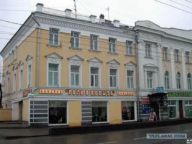 Недавно была в Костроме. Жаль, что проездом и только по делам. График был очень плотным, а хотелось посмотреть город. Даже из окона авто можно увидеть много интересного в этом, с одной стороны, удивительно провинциальном городе, с другой стороны, - в городе, с активно развивающейся инфраструктурой. Успела только пробежаться по центру, полюбоваться сохранившимися историческими зданиями. Печально, что они так заклеены многочисленными рекламными вывесками в невероятном сочетании: "Ритуальные услуги" - "Свадебный салон" - "Автозапчасти", - иногда сложно рассмотреть сам фасад. Мысленно поблагодарила мэра Москвы за то, что он убрал все это рекламное уродство с фасадов и улиц. Как говорится, почувствовала разницу. А пока рассыпалась в мысленных благодарностях, набрела на самую известную кофейню "Рога и копыта". Удовольствие от его посещения как от музея, в котором каждый уголок - это погружение в Мир шедевров Ильфа и Петрова, которые явили Миру Остапа Бендера и Кису Воробьянинова).