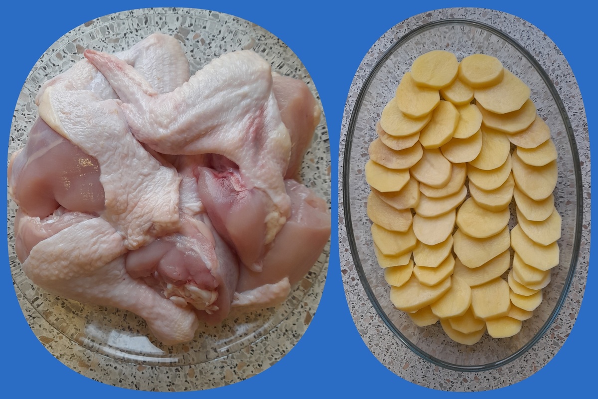 Ну вот картофель выкопан, а блюдо ещё не приготовлено. Главное дочка и сын лопают вместе с нами. У меня вся семья без этого овоща голодная, но и конечно немного мяса не помешает - два мужика в семье. Хочу поделиться рецептиком. Ингредиенты: Курицу промыть, разделить на куски, спинку убрать. Намыть и начистить картофель, нарезать кружочками около сантиметра в высоту. Картофель выложить на смазанное подсолнечным маслом блюдо, посолить, поперчить, посыпать зеленью ( укроп, пертушка). Соус для обмазки курицы: Все перемешать, каждый кусок курицы промазать и положить в блюдо на картофель. Сверху посыпать зеленью. Можно добавить лук кольцами или чеснок. В оставшийся соус добавить воды и размешать, это содержимое вылить в блюдо, добавить воды, чтоб картофель почти скрыло. Проставить в разогретую духовку на 180-200 градусов на 45-55 минут. Блюдо подойдёт как для обычного обеда, так и для праздничного стола. P.S. Получается нежирная курица и пропитанная мягкая картошка.