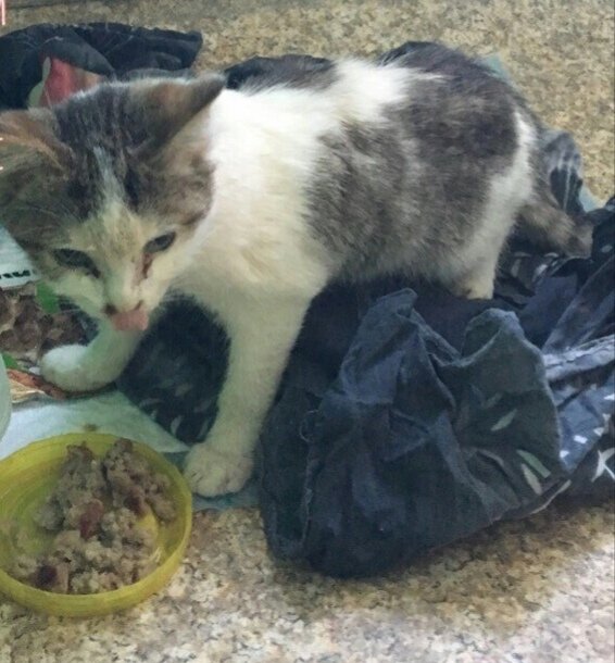 Как это всегда бывает, Олаф появился в доме непредсказуемо. Поступил звонок от знакомых, что в подъезд выброшен котенок, который находится там несколько дней, и с каждым днем, выглядит все хуже, уже практически не встает и не ест. Такое соседство не устраивало жильцов и от котёнка планировалось избавиться наиболее лёгким способом: вынести за дверь в обычный зимний день. Таким он был в первые дни пребывания в подъезде. Выглядел ещё достаточно неплохо! Везти в квартиру к остальным кошкам зверя без обследования и карантина было нельзя. Стал попутно решаться вопрос о его местонахождении в ближайшее время. Котенок был обнаружен лежащим в подъезде без движения и реакции на внешние раздражители. При срочной госпитализации в клинику, у котёнка не определялась температура тела и уровень глюкозы в крови. Сразу стала проводиться интенсивная терапия, попутно, были взяты анализы крови и тесты на вирусные инфекции, которые и могли привести к подобным последствиям. По анализам крови была выявлена