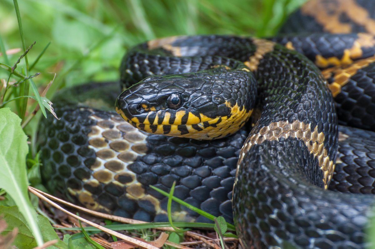 - Узнаваемый яркий окрас. Верхняя часть тела либо чёрная, либо тёмно-бурая. По бокам нечастые жёлтые, белые, косые или раздвоенные полосы. Достаточно часто на брюшной стороне у них видны пятна желтого цвета с тёмным вместе. Бывают эти змеи полностью чёрными. У взрослых змей есть переливающийся, чуть синий блеск на коже.
