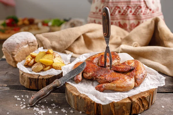 Натереть цыплёнка солью и аджикой. В нескольких местах на коже сделать надрезы, вложить в них по зубчику чеснока.