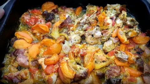 Продукты: свинина – 650 г, абрикосы – 250 г, помидоры – 250 г, лук репчатый – 2 средних луковицы, базилик сушёный – 1/3 ч.л., зира – 0,5 ч.л., куркума молотая – 1/2 ч.л., сахар – 1-2 ст.л, соль – 1,5 ч.л.