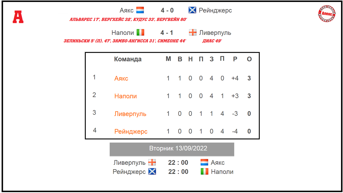 В Лиге Чемпионов полностью завершился первый тур группового раунда. Кто же выиграл в матче Барселона – Виктория? Смогли ли забить Кейн и Левандовски? Что сказал после матча Юрген Клопп. Аякс в первой группе с шашками наголо ринулся на Рейнджерс и победил врага 4:0. Лучшим игроком матча назвали кавалериста Кудуса, у которого один гол и пас. Ливерпуль в параллельной игре получили необъяснимое поражение от Наполи 1:4. Дубль сделал Зелиньски. Слушайте, а ведь неаполитанцы последний раз уступали 17 игр назад Эмполи. Таблица. 13 сентября Ливерпуль принимает Аякс. На прошлой групповой стадии клубы выиграли по 6 матчей в своих группах. Наполи отправиться в Глазго. Во второй группе центральным матчем была встреча в Мадриде между Атлетико и Порту (2:1). Жара началась на 81-й минуте, когда у гостей был удалён Тареми. Все голы были забиты в добавленное время. Антуан вырвал победу на 11-й компенсированной минуте. Я уже рассказывал, что клубы играли в одной группе в прошлом сезоне и Атлетико обобрал