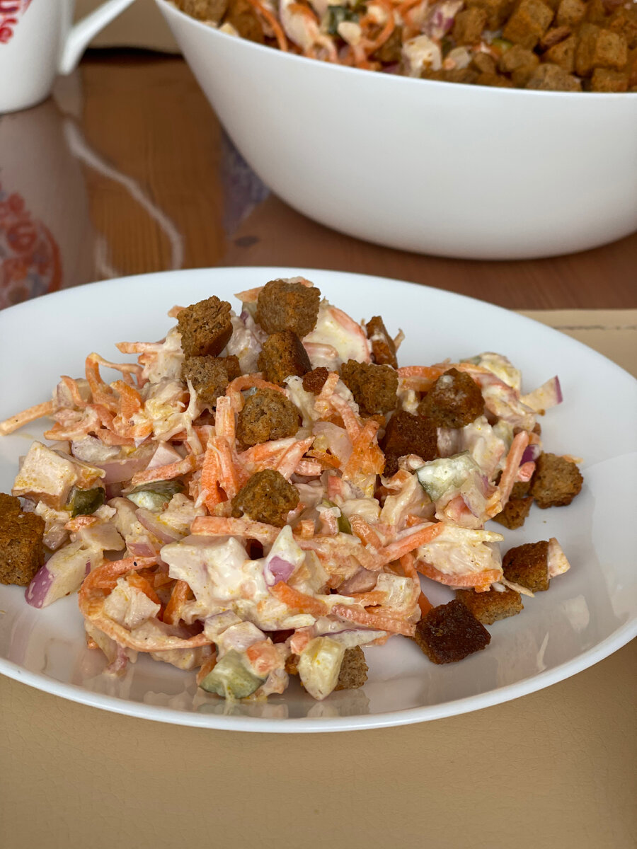 Из майонезных салатов я очень сильно люблю только два! И оба они с корейской морковкой! Вот один из них! Безумно вкусный, пикантный, со стола улетает самый первый! А готовить его всего 5 минут! Ингредиенты: Куриное филе и маринованные огурцы нарезать на маленькие кубики. Красный лук тоже мелко порезать. В миске смешать курицу, корейскую морковку, лук и огурцы. Выдавить через пресс чеснок. Перед самой подачей заправить майонезом и добавить сухарики. Сухарики на мой вкус подходят именно такие, но вы можете попробовать и другие варианты. Вот и весь рецепт! Мне кажется, этот салат не может не понравиться! Ниже видеорецепт этого салата.