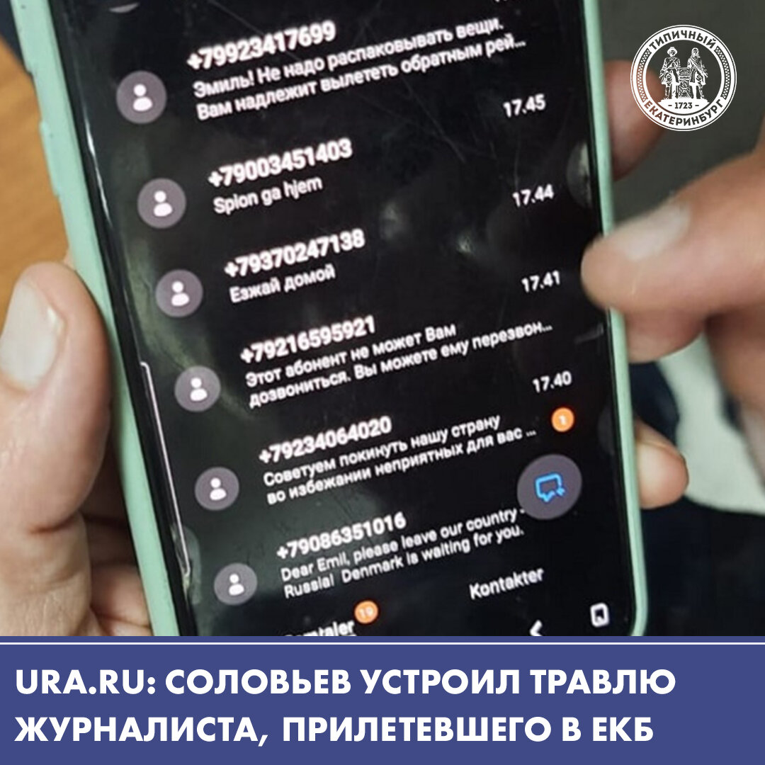 Телеведущий Владимир Соловьев в своем telegram-канале опубликовал пост, где корреспондента датской газеты Berlingske Эмиля Роттбелля назвали военным шпионом, приехавшим в Екатеринбург, и выложили номер его сотового телефона. После этого журналисту посыпались сообщения с угрозами и требованием убираться из России, сообщил общественник Владислав Постников. «Телеграм-канал этой самой „уральской команды Соловьева“, уже не раз публиковавший откровенные фейки, тут же объявляет журналиста военным шпионом, а сам Соловьев это моментально репостит и навлекает на гостя волну хейта. Не мог после этого не провести мини-экскурсию для гостя по Екатеринбургу. Рассказал Эмилю про наш город — его историю, здания, людей. Надеюсь, что сгладил впечатление от данных неадекватов», — говорится в посте Владислава Постникова. Общественник выложил фотографии телефона датчанина, на которых видны поступившие сообщения. «Вали из нашей страны, мразь!»; «Эмиль, не надо распаковывать вещи. Вам надлежит вылететь обратн