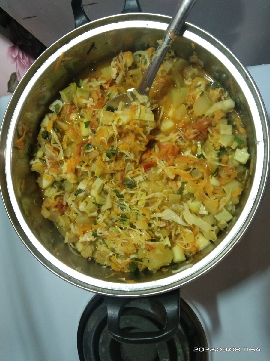 Здравствуйте , мои уважаемые подписчики и читатели !🥰 Сегодня я расскажу свой рецепт овощного рагу 🍲☺️ Состав : Лук репка ( резать полукольцами ) ; Куриное филе ( резать небольшими кубиками ) ; Морковь ( натереть на крупной тёрке ) ; Томаты спелые ( нарезать тонкими полукольцами) ; Огурцы свежие ( натереть на крупной тёрке ) ; Кабачок ( нарезать мелкими кубиками ) ; Капуста ( нашинковать средне ) . Готовить на подсолнечном масле или маргарине , на среднем огне , не включая с самого начала сильный , иначе пригорит , а после закипания убавлять на медленный , у кого электроплита , тем готовить на тройке и убавлять после закипания на двойку . Зелень : Лук - перо ; Листья укропа ; Любой салат , какой найдётся на вашем огороде или какой любите . Приправы : Куриный бульон ; Куркума ; Лаврик ; Семена укропа в розетке . Приготовление : Лук пассировать до золотистого цвета на подс . масле или маргарине ; Затем добавить кусочки мяса , как закипит и мясо начнёт белеть , добавляем морко