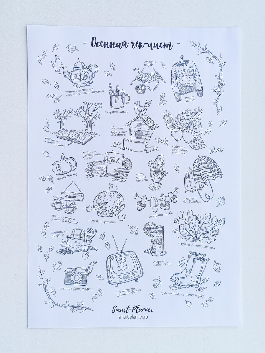 Всё лето я ничего не планировала. Жизнь шла своим чередом, иногда преподнося не очень приятные сюрпризы. Но наступила осень и я вернулась к ведению ежедневника, а соответственно решила заняться и планированием. Для наглядности планов, скачала и распечатала на самоклеющейся бумаге картинку с сайта пинтерест. В том году я уже использовала этот же шаблон, где раскрашивала каждое сделанное дело. Было интересно. Поэтому и в этот раз решила не мудрить. А вы составили уже планы на осень?!