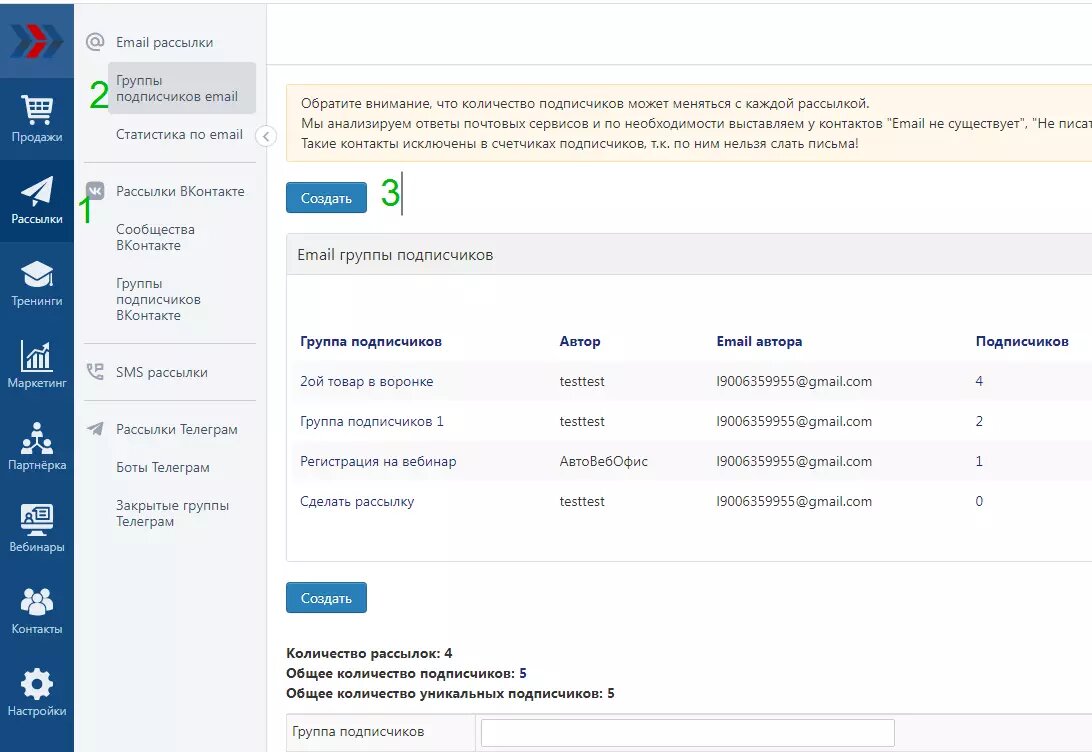 Группа подписчиков - это список подписчиков, которые подписались на рассылку определенной тематики. Для создания группы подписчиков следует в разделе (1) «Рассылки» перейти в (2) «Группы подписчиков» и нажать на кнопку (3) «Создать».