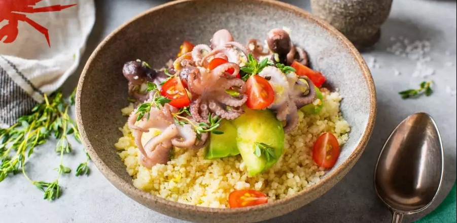Перекладываем кускус в тарелку, сверху кладём осьминогов с авокадо и разрезанные черри. Блюдо готово. Приятного аппетита!