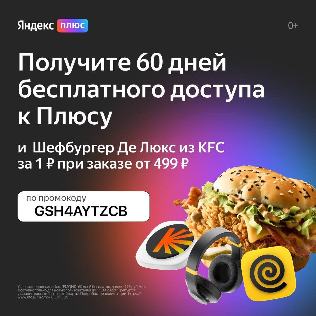 За 1₽ (вместо 363₽) получаем Шефбургер Де Люкс из KFC + 60 дней подписки на Яндекс Плюс! 💻🎧🎵🚕 В подписку входит: — Доступ к музыке и подкастам на Яндекс Музыке 🎶 — Доступ к тысячам фильмов и сериалов на Кинопоиске 📺 — Кешбэк баллами 10% при заказе такси тарифов Комфорт и выше 🚕 — И многое другое Заходим в раздел активации кодов, и активируем промокод: GSH4AYTZCB ❗Актуально только для новых пользователей. 🍔Промокод на Шефбургер Де Люкс вы получите на электронную почту или номер телефона в течение суток. Вводите его на сайте и в приложении KFC при заказе от 499р, не забудьте добавить в корзину Шефбургер Де Люкс. Стоимость Шефбургера пересчитается автоматически.