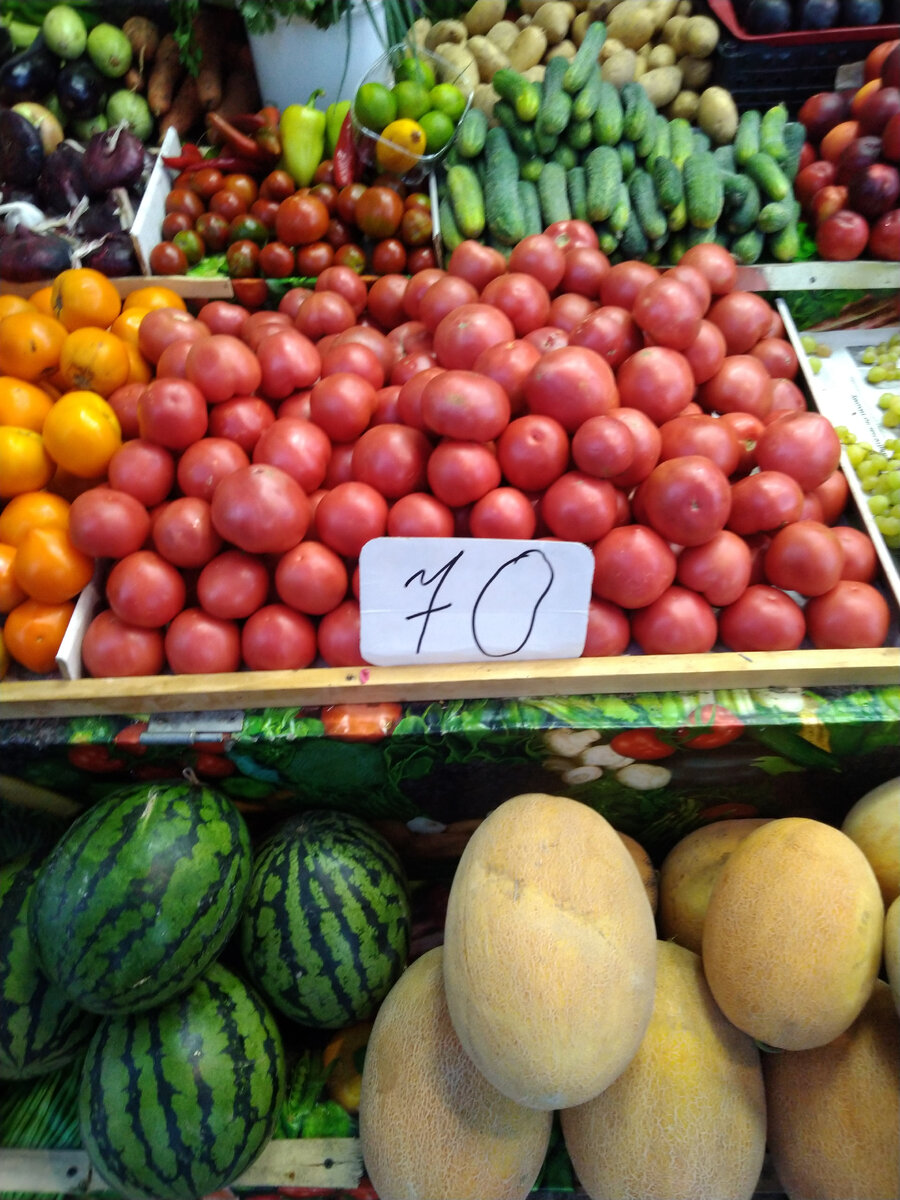 Добрый вечер всем! Как я уже писала, в августе мы с семьёй отдыхали в посёлке Джемете (район Анапы). От нашего отеля до пляжа было примерно 500 метров по прямой. На пути встречалось много столовых, кафе, торговых палаток. Так что по пути на пляж или обратно можно было поесть, купить овощей и фруктов, приобрести сувениры. Сегодня познакомлю вас ассортиментом товаров и ценами на них. Цены на помидоры и персики от 70 до 130 рублей за кг. Арбузы стоили 15 - 25 рублей за кг. В местном "Магните" арбузы стоили 10 рублей за кг. Дыни дорогие - 60 рублей за 1 кг. Хотя, когда мы вернулись домой, зашли в магазин, дыня стоила 80 рублей за 1 кг. Виноград 100 - 150 рублей за 1 кг. Малина, клубника 250 рублей за такой контейнер. Ягоды в маленьком пластмассовом стакане (200 мл.) 100 рублей, в стакане побольше (500 мл.) 250 рублей. Местные продавцы стараются привлечь внимание отдыхающих интересными надписями. Листайте галерею. Горячая кукуруза 50 рублей за штуку, на пляже 100 рублей за штуку. Много раз