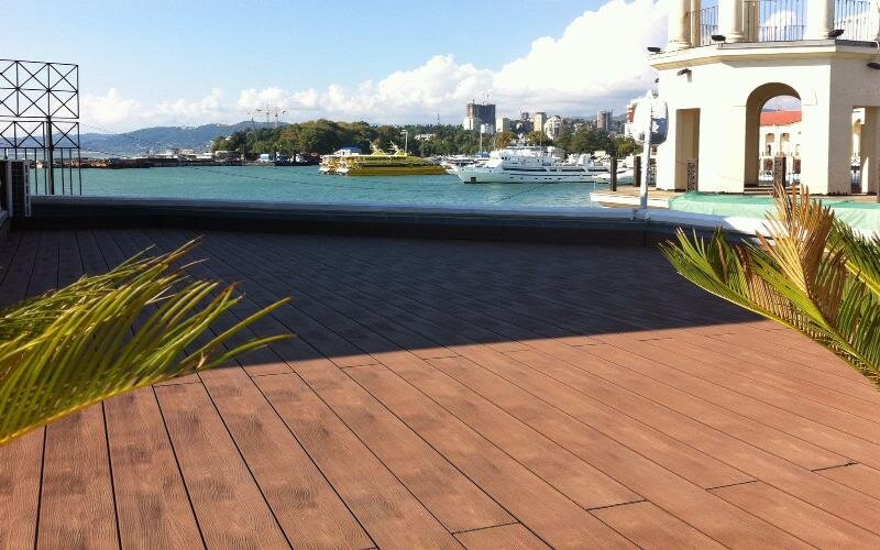 Декинг, или композитная террасная доска разработана специально для использования в уличных условиях разных регионов и климатических зон. Она отлично выдерживает морозы и жару, ветер и дождь, палящие солнечные лучи и снегопад. Из полнотелого декинга сделано много городских и около городских объектов: пирсов, летних кафе, зон отдыха, пешеходных дорожек больших и малых городов. Материал превосходно показал свою износостойкость и прочность, как на юге, так и на севере.