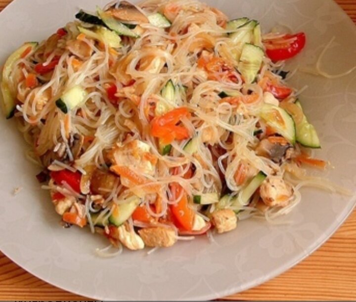 Берем фунчозу и завариваем ее кипятке. Пока фунчоза заваривается, нарезаем все овощи на тонкую соломку 4-5 см. Курицу нарезаем кубиком. Наливаем масло на сковороду и обжариваем курицу. Как только курица станет красивого цвета, добавляем к ней все овощи, кроме огурца. Солим и перчим по вкусу. Обжариваем до мягкости овощей (10 минут). Как только наше мясо с овощами готово, добавляем фунчозу на сковороду к овощам и добавляем 1-2 столовые ложки соевого соуса. Вот теперь добавляем нарезанный огурчик. Все, выключаем и бежим кушать. Приятного аппетита!