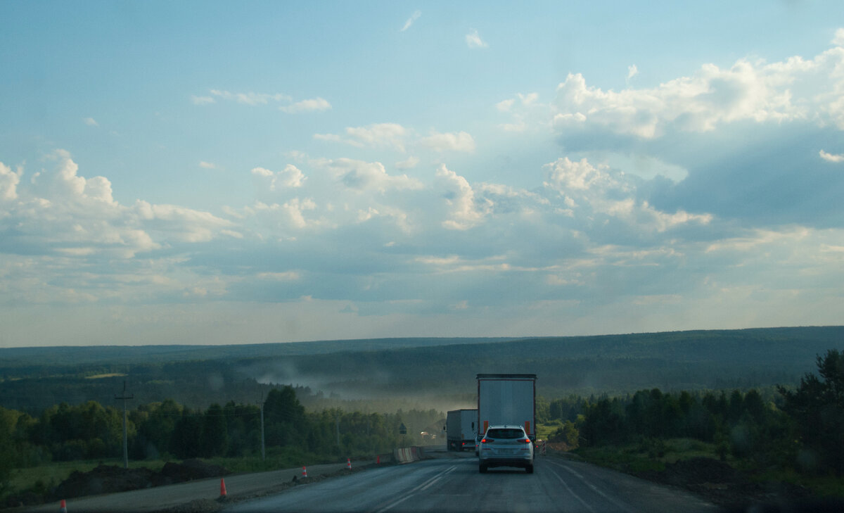 12.07.2021 19.00. Пробка. Тащимся в пыли по "гравийке". Хорошо, что дальнобойщики встали в шахматном порядке и не давали "обочечникам" проехать, а то бы стояли до осени... 🙂 Когда не двигались Миша протирал окна от насекомых и пыли. Хорошо что вечер и не так жарко. Спустя час, полтора выехали. Едем в сторону Новокузнецка.