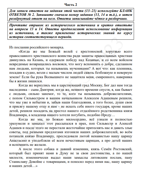 Продолжаем разбор Демоверсии ЕГЭ по истории 2023. На этот раз посмотрим вторую часть работы. Смотрите разбор первой части, если вам интересно, а мы продолжаем. Вторая часть экзамена состоит из 9 заданий, однако баллов вы сможете набрать больше, чем за первую часть (22). Задания по тексту Начинается вторая часть именно с подобных заданий. Разумеется, одно задание (14) в принципе можно сделать, если вы умеете читать, но вот в 13 уже нужно показать свои знания. За оба задания вы получите по 2 балла. Давайте посмотрим. А вот и задания. Решение: 13-Читаем текст, понимаем, что речь идет о взятии Казани, Избранной Раде. Значит, автор документа - тот, кто больше всех от Избранной Рады пострадал. А это Иван Грозный, правивший страной в XVI веке. Ну а переписку он вел с Андреем Курбским. 14- Тут уже нужно найти в тексте 3 обвинения в сторону приближенных. Главное - избегать цитирования. Смотрим на 1 абзац, видим, что жизнь царя подвергли опасности после возвращения из Казанского похода. Во в