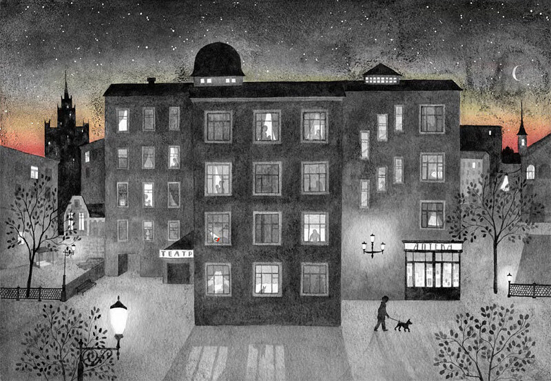 «Соседи» – первая книга Каси Денисевич как автора и художника, которая сначала вышла на английском языке, а затем в России, в издательстве «Карьера Пресс». «Все началось с одной картинки, – рассказывает Кася. – Я тогда жила в Барселоне и очень скучала по своему московскому дому, так что решила его нарисовать. Получилось изображение дома в разрезе со множеством квартир, среди жильцов – мои настоящие соседи и друзья. И вокруг этой картинки постепенно вырос сюжет». Автор посвятила книгу двум своим дочерям, и читать ее лучше вместе с детьми старше шести лет. Кася говорит, что композицию книги, разворот за разворотом, она сначала описывала для себя словами (ведь по образованию она филолог), чтобы потом создать особый визуальный язык, когда текст, рисунки и сама форма книги вместе рассказывают историю. (Мне кажется, это похоже на работу сценариста и режиссера кино, только в одном лице.) Главная героиня, девочка в красном платье (возраст младшей школы), переезжает в новый дом: вот она едет по