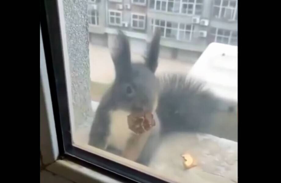 Видео: Белка стучит в окно девушки, чтобы купить у нее на шишки орехи