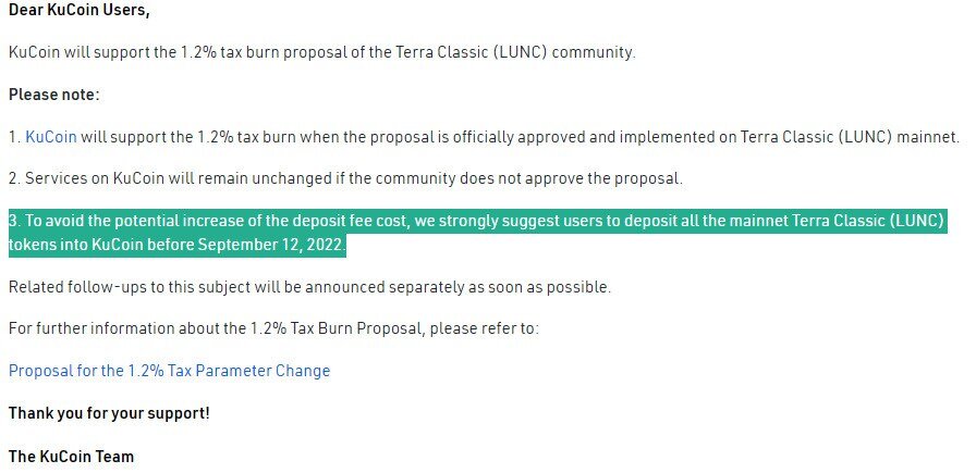 KuCoin пишет, не хотите платить 1,2% налога с депозита – внесите LUNC на биржу до 12 сентября. В объявлении от Gate[.]io также идет речь о сжигании на ввод/вывод. А в своем блоге они написали: