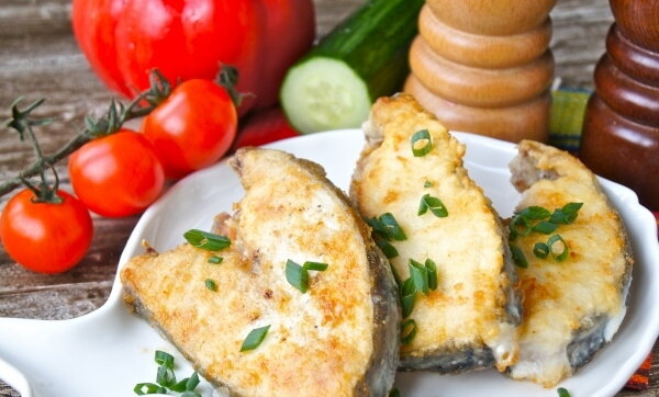 7. Подготовленные стейки зубатки отправляем в сковороду с хорошо разогретым растительным жиром. В таком виде угощение жарится около четверти часа. Это время распределяем равномерно на каждую сторону кусочков. В процессе периодически переворачиваем стейки широкой лопаткой.