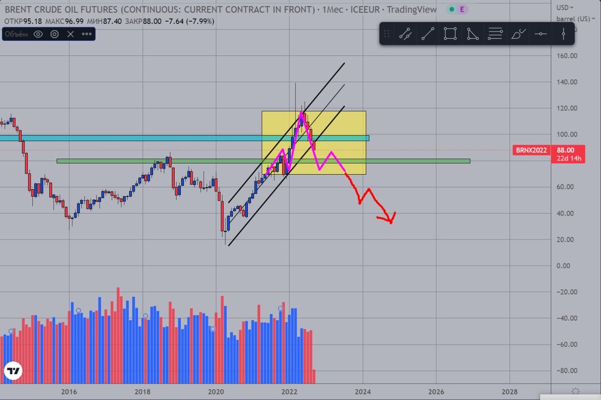 Ранее предсказанное при цене $100 снижение цены нефти Brent идет по плану – сейчас цена уже $88. Напомню, что цели указывал так: “❗️Далее, очень даже допускаю снижение в район $80 (и даже до $60).” 😱 Скажу больше, пока оччччень теоретически не исключаю снижение даже в район $40. Намекает мне об этом почти сформированная половина фигуры Голова-плечи (выделена желтым и сиреневым). Все это умозрительно пока, поэтому всерьез про такой уровень пока не думаю. Но все же где-то на задворках внимания оставляю… О наших нефтяниках не переживал бы сильно – на ценообразование их акций выручка от нефти играет все меньшую роль. ☝️Наоборот, считаю, что будет рост их котировок. #Brent