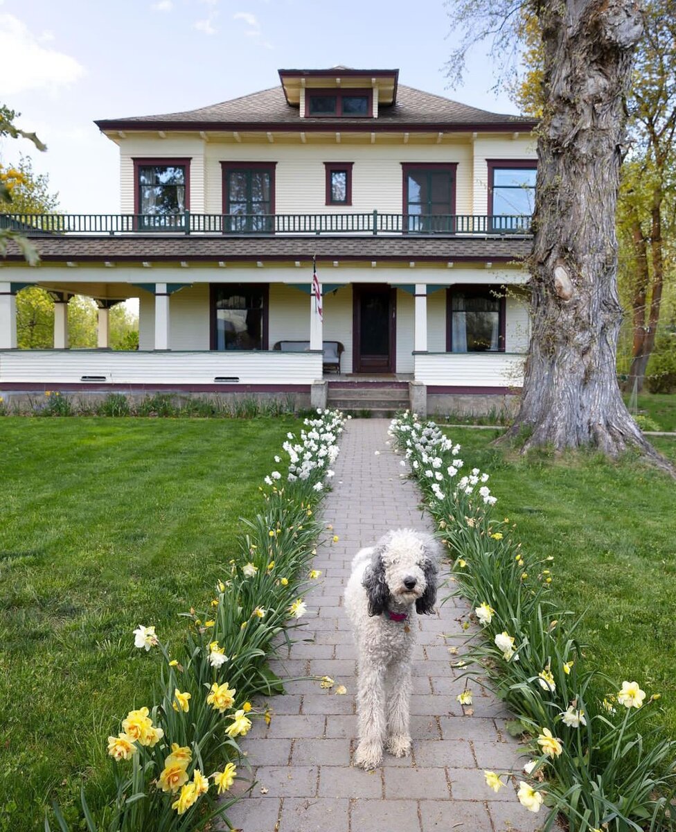 Сегодня мы побываем в гостях в фермерском доме в США, где проживает семья из 5 человек и собака породы пудель по кличке Сильви. Семья состоит из супружеской пары и трёх детей: двух сыновей - двойняшек и дочери. Ремонт в доме супруги делали полностью самостоятельно: меняли полы, красили стены и мебель. Этим семья занималась, пока длился карантин. Для стен выбрали моющуюся краску в оттенке " слоновая кость ". Двери, плинтуса и лестница из натурального дерева, покрытого тёмным лаком. Мебель супруги в основном покупали на сайте подержанных вещей со скидкой 70-80%. Вид дома снаружи. Дом обшит белым сайдингом. Просторная веранда позволяет проводить время на открытом воздухе даже в дождливые дни. Это очень важно, т. к. в семье трое детей. Прихожая. Из прихожей можно сразу попасть в гостиную. Рядом с дверью зеркало в разной раме и консольный столик в цвет дверных наличников. Гостиная выдержана в строгом английском стиле. Люстра гармонирует с латунными карнизами и рамками для картин.