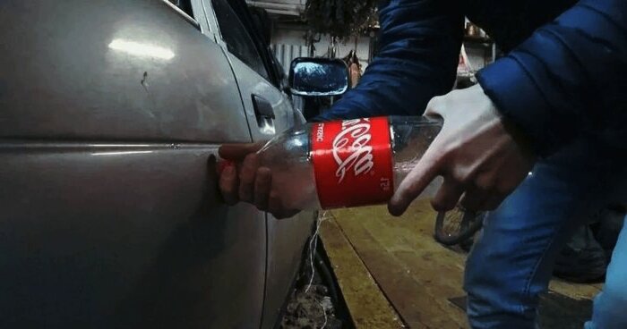 Процедура избавления от вмятины при помощи бутылки из пластика.