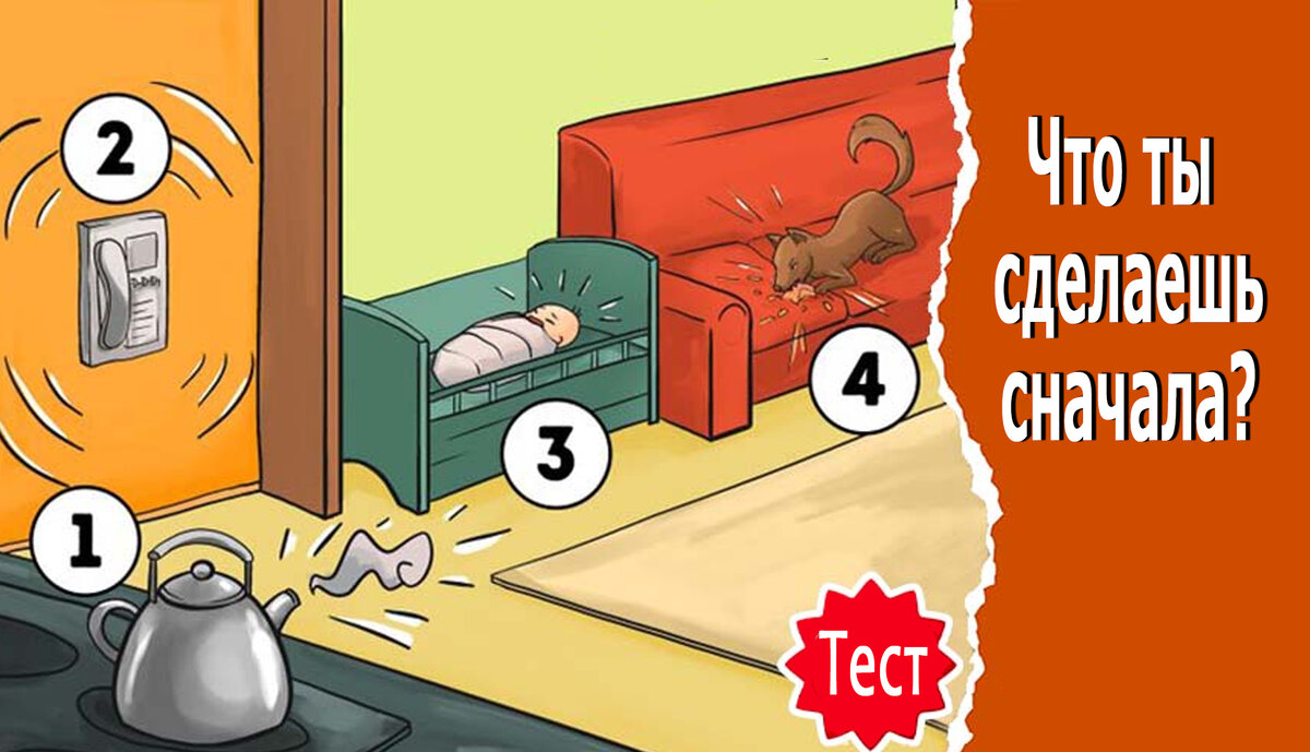 Что бы вы сделали в этой ситуации? Этот забавный тест поможет вам лучше узнать себя. Как вы знаете, каждый наш выбор, так или иначе, зависит от нашей личности. Главное, ответить очень быстро. Просто ответьте на вопрос «что бы вы сделали в этой ситуации». Результаты: что бы вы сделали в этой ситуации в первую очередь? 1. Если сначала вы выключите кипящий чайник … Если вы выбрали чайник, то это может говорить о том, что вы человек увлеченный и прямолинейный. Вы принимаете решения быстро и не задумываясь. Вы уверены в себе и ничто не помешает вам достичь своей цели. Вы цените комфорт и не любите сюрпризов и разочарований. Вам легче придерживаться четкого, определенного плана, свободного от резких поворотов. 2. Если вы сначала ответите на телефонный звонок… Ответ на телефонный звонок может указывать на то, что вы сосредоточены и дипломатичны. Вам не нравится упускать никакую возможность. Большинство людей оценивают вас, как занятого человека, который может работать в режиме многоза