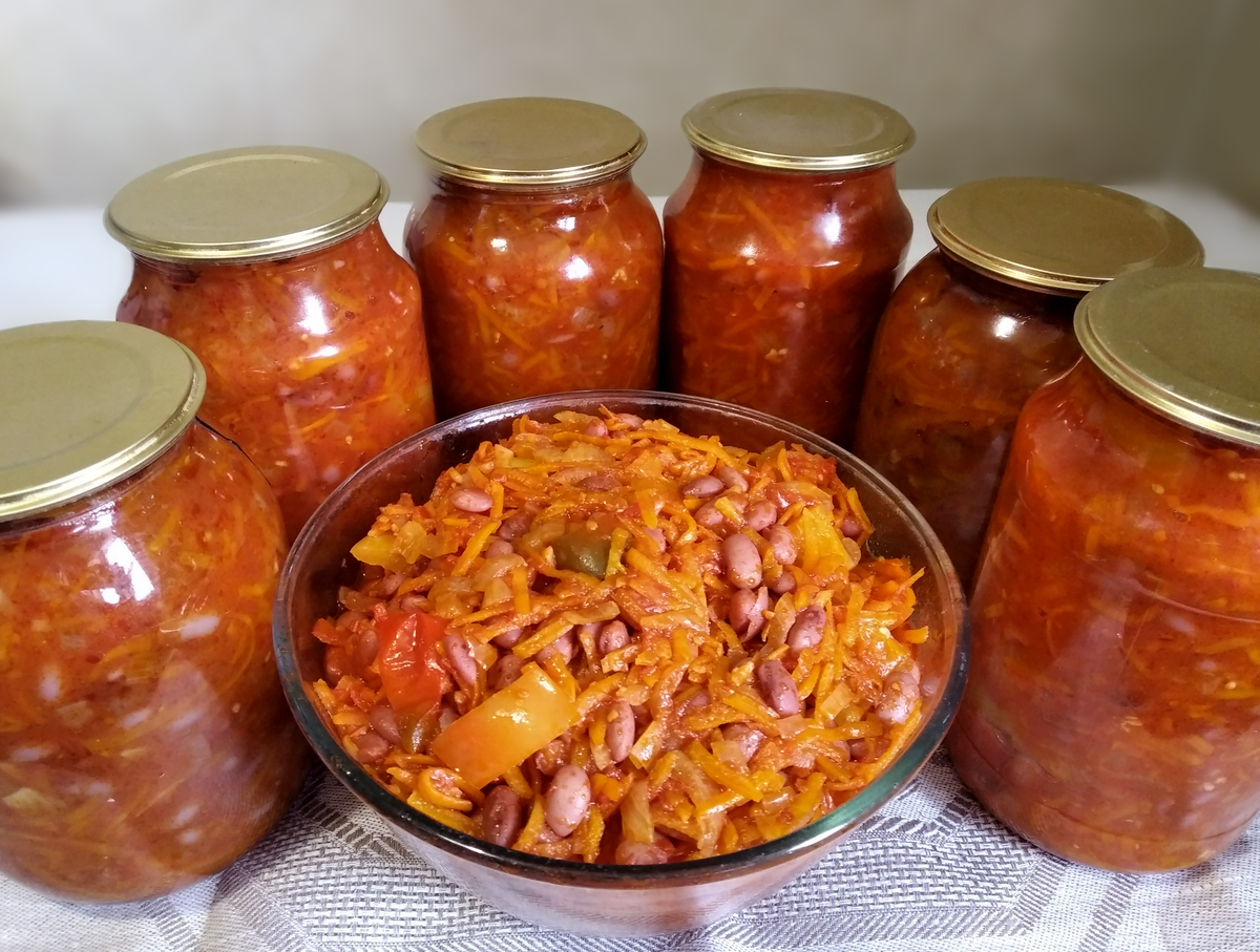 Уксус 9% - 90 г Процесс: 6. Добавляем к смеси обжаренные лук и морковь. Тушим, помешивая, ещё 10 минут. В последнюю очередь закладываем фасоль. Варим 10 минут. 7. За 2-3 минуты до окончания добавляем измельчённый чеснок. В процессе приготовления пробуем салат на соль и сахар. Если чего-то не хватает — добавляем. 8. Банки и крышки заранее стерилизуем. Накладываем в банки кипящее лечо, закатываем крышки, переворачиваем, укутываем и даём полностью остыть.