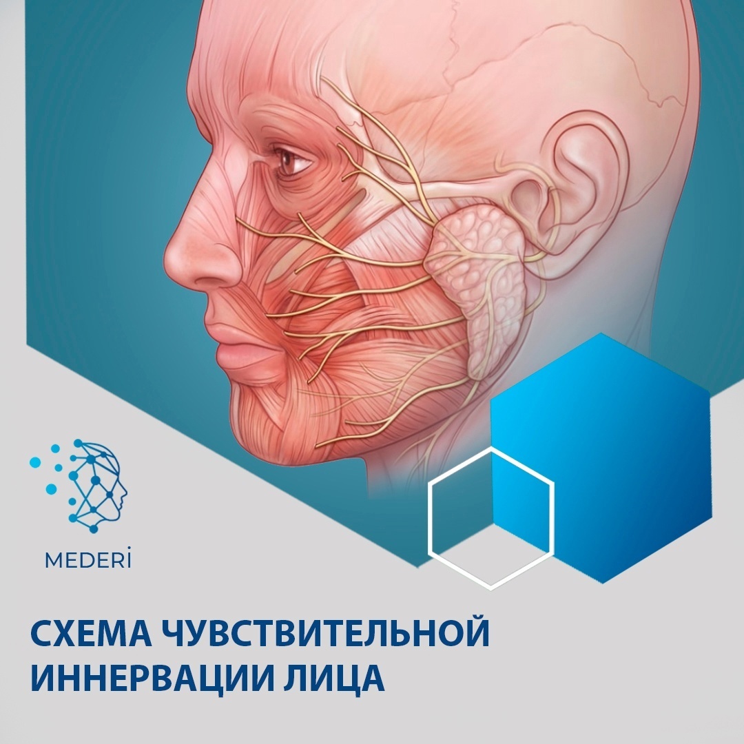 Чувствительная иннервация лица обеспечивается в первую очередь тройничным нервом (V пара нервов). После отхождения от тройничного ганглия он отдает три ветви: Глазничная ветвь является наименьшей из трех. После отхождения от тройничного ганглия она проходит через верхнюю глазничную щель, разделяясь на три конечные ветви: носо-ресничную, лобную и слезную. Они иннервируют нос (посредством подблокового и наружного носового нервов), кожу лба и верхних век (посредством слезного, надблокового и надглазничного нервов). Верхнечелюстной нерв является средней ветвью тройничного нерва, он покидает полость черепа через круглое отверстие и входит в крылонебную ямку. Перед прохождением через подглазничное отверстие он отдает ветви к крылонебному ганглию, а также скуловую ветвь. Перед тем, как покинуть подглазничное отверстие и стать кожным подглазничным нервом, он отдает скуповисочную и скулолицевую ветви (ответственен за чувствительность кожи висков, верхней части щеки, нижних век, верхней губы, ве