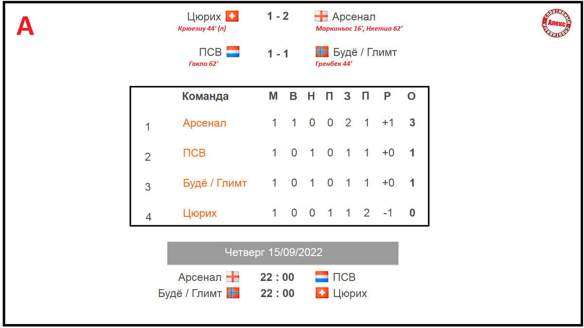 Доминирование Арсенала в матче с Цюрихом привело к логичной победе 2:1. Маркиньос и Нкетиа показали хорошее взаимодействие, забив по голу и отдав друг другу результативный пас. У «канониров» с атакой всё в порядке, команда забивает в каждом из последних 12-ти матчей. Будё/Глимт вышел на ринг с ПСВ и отстоял пояс чемпиона Норвегии 1:1. В конце первой половины забил Гренбек, а Гакпо на 62-й минуте огорчил российского вратаря Хайкина.