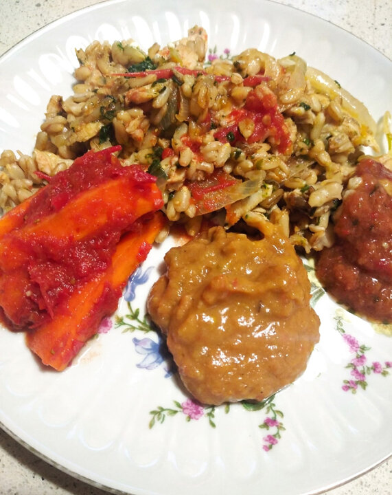 А что у вас сегодня на завтрак? У нас - каша из цельного зерна овса. Очень нравятся каши именно из такого зерна, несладкие. Любим, когда есть овощи и зелень в ней. И очень хорошо с какой-нибудь «белковой» добавкой. Сегодня, например, немного запеченного филе индейки. Итак, как её готовить? С вечера приготовила крупу. Предварительно тщательно промыть зерно в нескольких водах, замочить на 3-4 часа, затем отварить до готовности (около 30 минут). Вот и всё, крупа готова. Оставляю на ночь, готовлю исключительно в керамическом горшке, на плите. Пропорция «крупа-вода» - 1:3. Когда выключила огонь, жидкость ещё на поверхности крупы была. Сама крупа была довольно-таки вязкая. Утром вся вода впиталась, крупа стала очень похожа на перловую. По ощущениям – немного «аль денте», но мне кажется, что овёс больше не разварится. Который раз готовлю, практически всегда получается таким. А утром: Обжарить луковицу, кусочки запеченного филе (в данном случае индейки, весом граммов 250), один помидор, один с