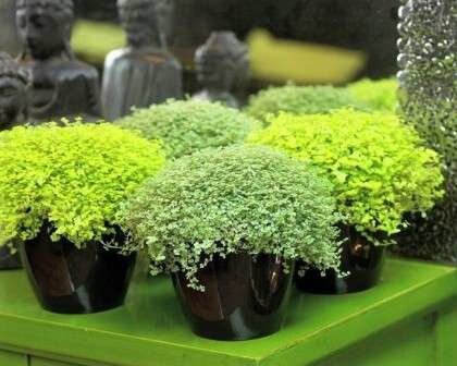 Для тех, кто любит украшать окна живыми зелеными шарами, подойдет Солейролия. Это ажурная травка быстро разрастается, стелясь по земле и создавая над горшком воздушную подушку. Различные виды отличаются оттенком маленьких листочков. Солейролию нередко подсаживают в вазоны с крупными цветами для увеличения декоративного эффекта.