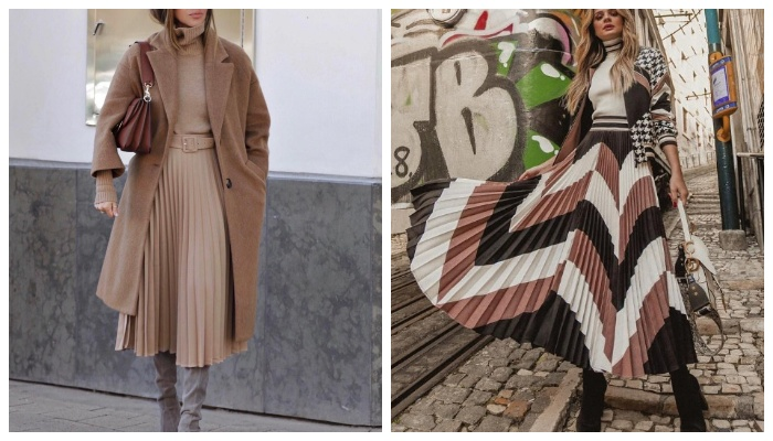 В вашем гардеробе имеется стильная юбка плиссе. Стилисты предлагают нам вдохновиться шикарными примерами осенних образов с юбкой плиссе, которые вы с легкостью сможете повторить. Белоснежная миди юбка плиссе + бежевое кашемировое пальто + лонгслив песочного оттенка + каркасный клатч + яркие ботильоны на каблуке — образ, в котором можно пойти, как на работу, так и в театр. В следующем аутфите немаловажную роль играет цветовое сочетание: золотая юбка плиссе + пальто цвета марсала + белый свитер ажурной вязки + остроносые ботильоны-чулки винного оттенка. Осенью юбку плиссе смело можно комбинировать с классическими моделями пальто, ярким однотонным свитером с высокой горловиной, белой рубашкой и высокими белыми сапогами на громоздком каблуке. В начале сезона, когда погода позволяет, жакеты можно сочетать со всевозможными по цвету и длине юбками плиссе. Вместе две эти вещи смотрятся максимально гармонично и целостно. Чтобы образы выглядели завершено, к этому тандему можно добавить рубашку,