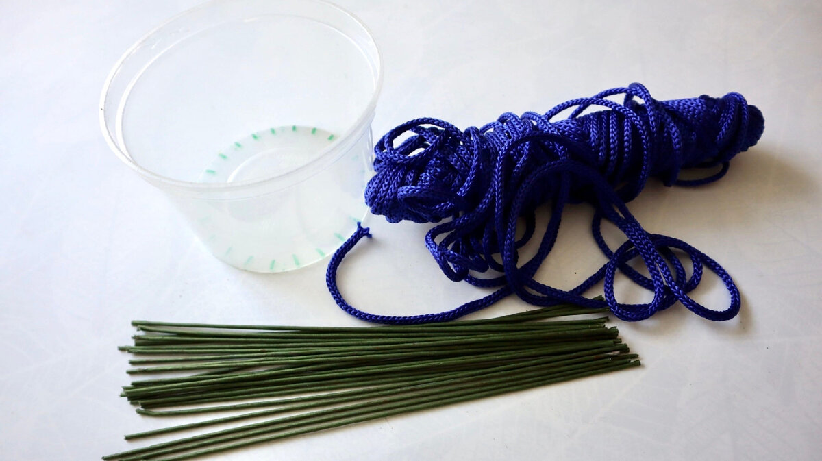 - Для моей вазы понадобилась прозрачная пластиковая коробочка. В таких продают квашенную капусту, корейскую морковь, мед. Так же взяла флористическую проволоку и веревку синего цвета, можно взять шпагат.