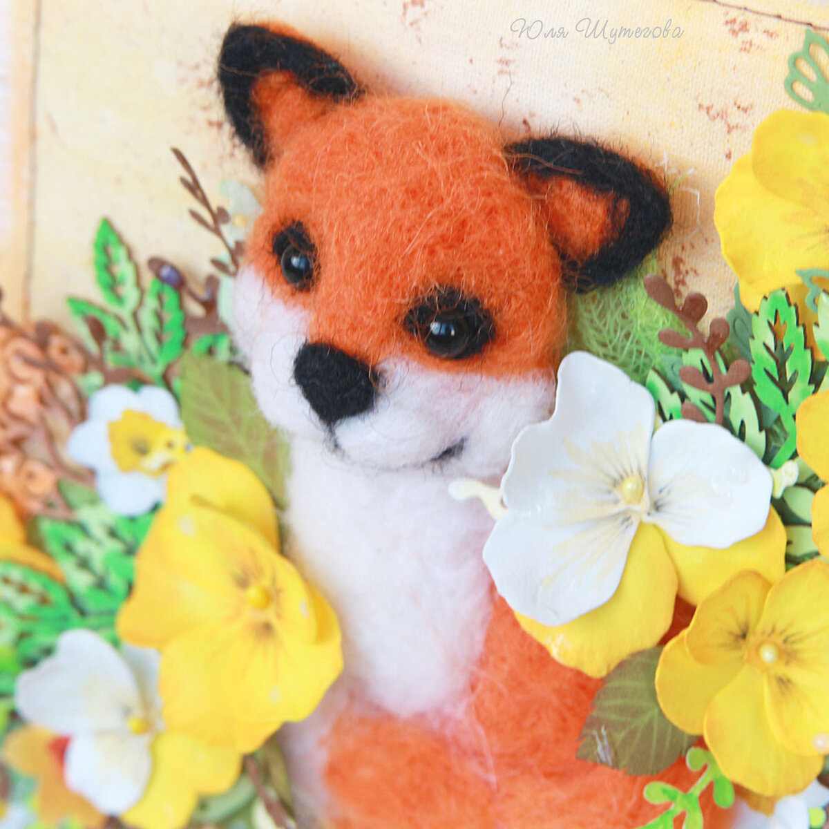 Доброго времени суток! Представляю вашему вниманию яркую открытку с милым лисенком, который наслаждается солнышком среди ягод, цветов и листвы. Размер открытки: 15х15 см Основа выполнена из однотонного дизайнерского картона (плотность 200гр/м2), которая оформлена текстильной подложкой. Подложка сделана с нуля и окрашена акварельными красками. Дополнительно прошила подложку на машинке коричневой нитью. Главный персонаж и основной элемент открытки - лисенок. Его я сделала из шерсти для валяния 🦊 Лисенка окружает композиция из цветов ручной работы (анютины глазки из фоамирана), вырубных листочков и веточек и декоративных ягод. Ягодки - это чипборд, которой я окрасила художественными маркерами и покрыла прозрачной пудрой для эмбоссинга. Веточки и листики - бумажная вырубка. Их я сделала при помощи специальных ножей и машинки для вырубки. Все вырубные элементы дополнительно декорирую красками, чтобы они смотрелись более живыми и интересными. Разбавляют композицию из объемных элементов цв