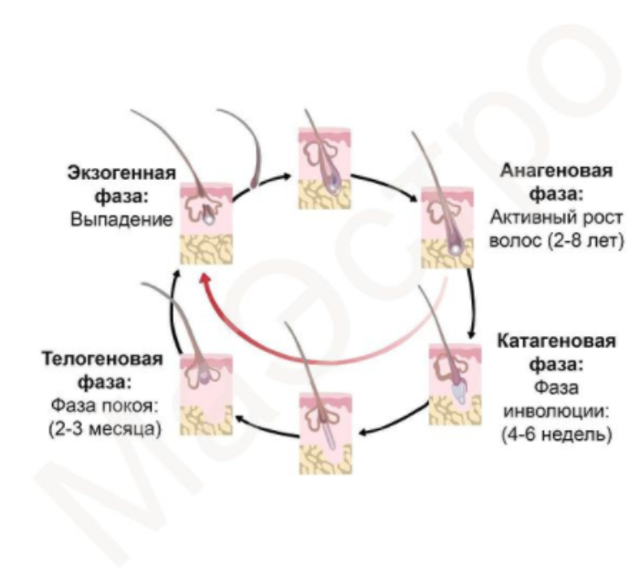 Коллеги. Для того что бы понять как на нашем теле растут волоски и почему до сих пор не существует 100% удаления из навсегда нужно знать саму структуру жизни волоса и конечно его зарождение и формирования. Для начала я хотел бы рассмотреть фазы жизни (роста волоса). 1. Ранний анаген. Период зарождения волоса. Именно на него я бы хотел сделать основной акцент в статье. 2. Анаген. Та самая общая стадия к которой стремится каждый мастер и клиент. Это стадия активного роста волоса. Варьируется от 2 до 8 лет. 3. Катаген. Переходная или промежуточная стадия (переход к отдыху). Говоря простым языком, это фаза инволюции волосяного фолликула которая длится от 4 до 6 недель. 4. Телоген. Период покоя волосяного фолликула который длятся от 2 до 6 месяцев. Так как в телогеновой фазе волосы находятся до 6 месяцев, усиленное выпадение волос происходит, именно спустя этот период после стресса. Поэтому люди и не связывают временное облысение с эмоциональными факторами. 5. Экзоген. Фаза акт