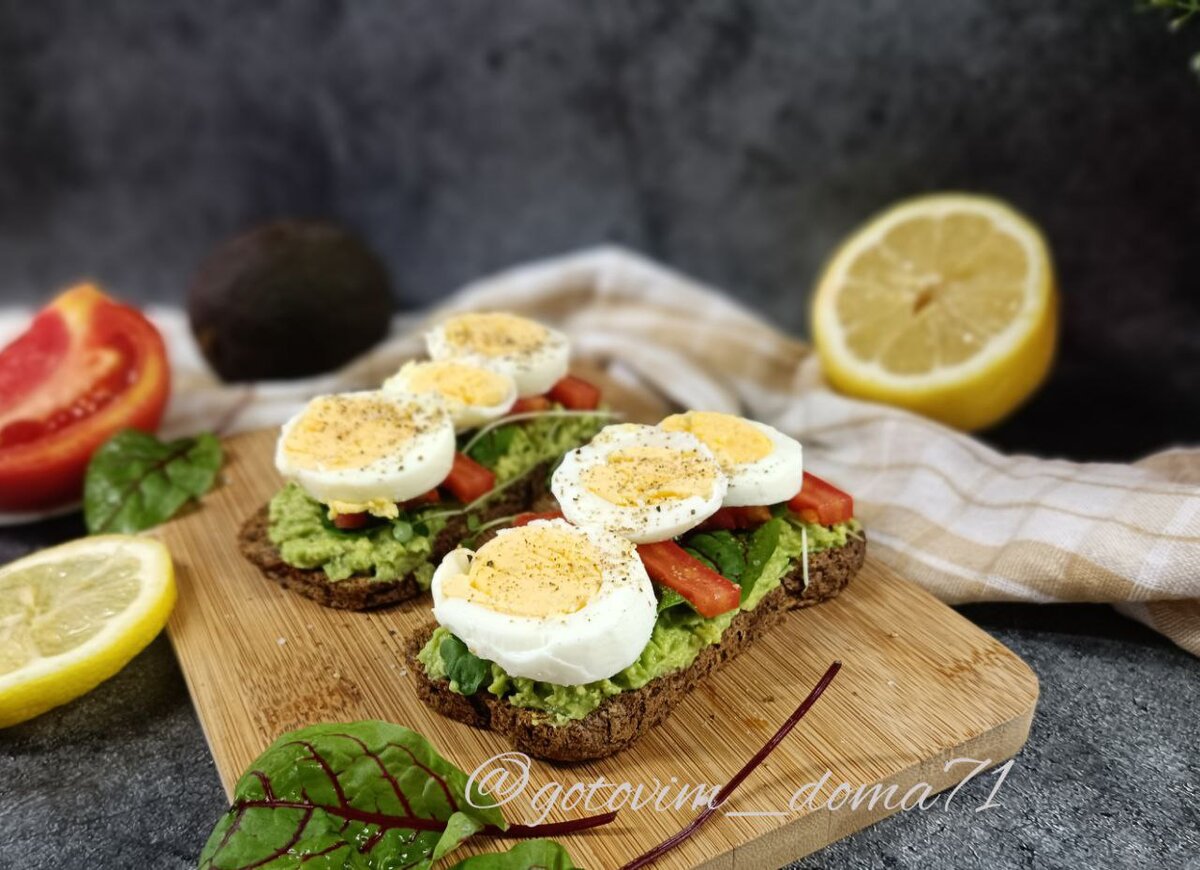 Приготовить этот полезный и вкусный завтрак не составит труда. Вы всегда можете немного его изменять, добавляя разную зелень или овощи (лук, огурцы) Подготовить все ингредиенты. Яйца сварить вкрутую. Авокадо разрезать, удалить косточку. Вытащить мякоть, размять вилкой. Посолить, поперчить, добавить сок лимона 5-10 капель. Перемешать. 2 кусочка хлеба поджарить на гриле или на сковороде. У меня цельнозерновой ржаной. Намазать на него пасту из авокадо. Сверху выложить зелень. Помидоры и яйцо. Посолить и поперчить. Очень вкусно! Приятного аппетита! Ингредиенты: 2 яйца 1 авокадо 2 тоста 1/4 часть помидора Зелень По вкусу соль По вкусу перец Лимонный сок #ппрецепты #завтрак #рецепт #авокадорецепты #полезноепитание