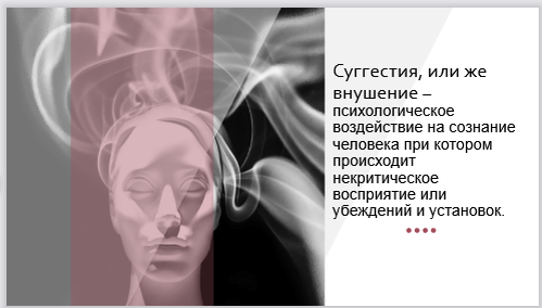 Таким образом, важно, чтобы человек, подвергающийся воздействию, был готов к нему, доверял тому, кто внушает. И немаловажно, чтобы техника была подобрана правильно.