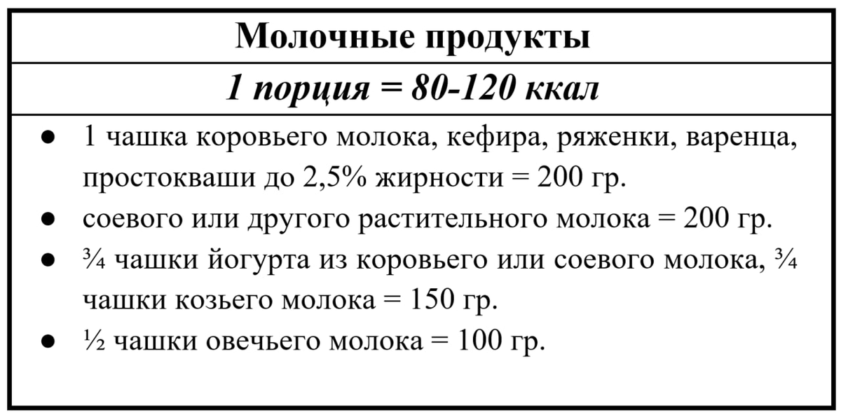 Что относится к молочным продуктам? К группе молочных продуктов относятся все жидкие молочные продукты и продукты, приготовленные с использованием молока и сохранившие при этом высокое содержание кальция. Желательно, чтобы большая часть группы молочных продуктов была низкой жирности. Продукты из этой группы обеспечивают более 50% кальция суточного рациона. Соевое молоко и другие виды «растительного» молока, обогащенные кальцием, также является частью молочной группы. Продукты, сделанные из молока, в которых мало кальция, такие как сливочный сыр, сметана, сливки и сливочное масло, не входят в эту группу. Сколько молочных продуктов нужно съедать ежедневно? Ежедневное количество молочных продуктов должно подбираться индивидуально. Оно зависит от возраста, пола и уровня физической активности, заболеваний и от того нужно человеку снижать вес или нет. В пирамиде питания среднее рекомендуемое количество молочных продуктов для мужчин и женщин это 2 – 2,5 порций. Что такое 1 порция молочных про