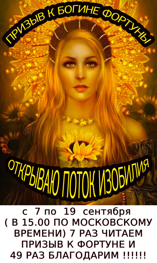 с 7 по 19 сентября ( В 15.00 ПО МОСКОВСКОМУ ВРЕМЕНИ) 7 РАЗ ЧИТАЕМ ПРИЗЫВ К ФОРТУНЕ И 49 РАЗ БЛАГОДАРИМ !!!!!!