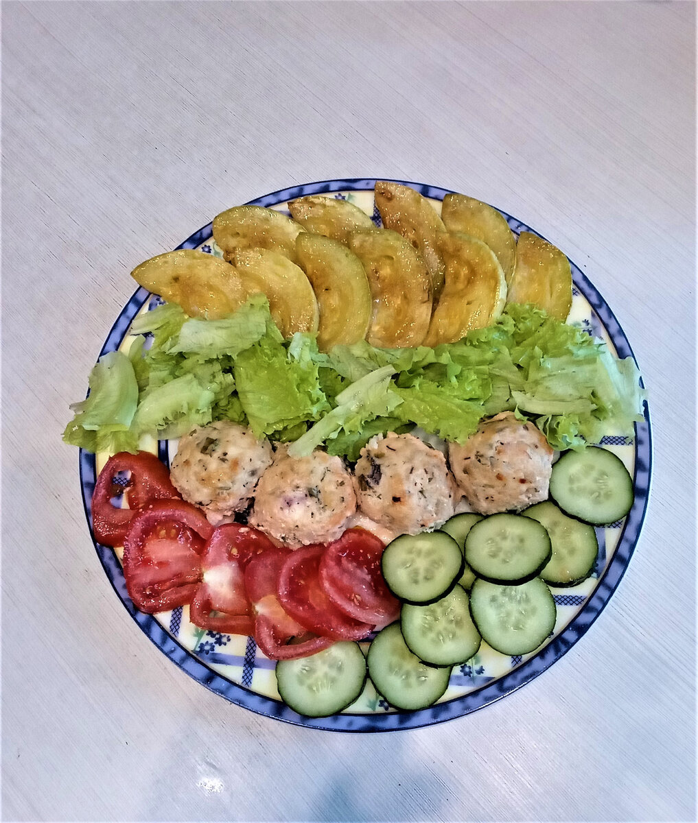 Всем добрый вечер! Сегодня в меню тефтели. Вкуснотища получилась 😋! Рецепт, как всегда -- простой и по составу, и по приготовлению. Ну и ППшно, как всегда. Кстати -- месяц уже, как я на ПП. Скинула 3кг. Не много конечно, как если бы с танка гайка отвалилась 😂. Буду дальше продолжать! По калорийности: тефтели ~ 130кк - 100гр, кабачки ~ 80кк - 100гр. Смешиваем куриный фарш с рисом, травами/приправами, луком/чесноком, Солим, перчим по вкусу. Рис был отварен заранее. Готовим соус, в котором будем тушить тефтели (белый йогурт, соевый соус, томатная паста, чеснок, вода). Немного соуса наливаем на дно формы. Выкладываем тефтели. Затем доливаем оставшийся соус сверху, закрываем фольгой и ставим в разогретую до 200* духовку на 30 минут. Через полчаса снимаем фольгу и даём тефтелям запечься/подрумяниться сверху. Где-то минут 15. На гарнир у меня был кабачок жареный на сковороде. Предварительно замаринуем дольки кабачка (чуть соли, чуть соевого соуса, растительное масло 10-15гр). Обжариваем с д