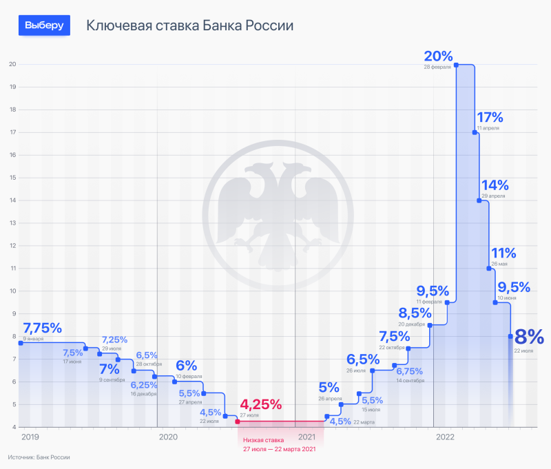 За последние годы рост цен вызван немонетарными факторами, а значит, усмирить инфляцию с помощью ключевой ставки невозможно, уверены эксперты ЦМАКП. Зато повышенные ставки убивают экономику. Но ЦБ упорно этого не замечает и снова сигнализирует о готовности если не повысить ключевую ставку, то сохранить на текущем уровне. Как менялась ключевая ставка с 2019 года? Инфографика: «Выберу.ру» Ключевая ставка не влияет на инфляцию За последние два года скачки цен наблюдались дважды. В 2021 году инфляция ускорилась из-за неурожая овощей. В 2022 году виной бурного роста цен стала паника людей, считают в Центре макроэкономического анализа и краткосрочного прогнозирования (ЦМАКП). Оба фактора носят немонетарный характер. Значит, повышением ключевой ставки на них нельзя повлиять. В результате будет убита экономика, а не инфляция. На цены также влияет импорт инфляции из-за границы и повышение тарифов со стороны властей. С этими факторами тоже неэффективно бороться с помощью ключевой ставки. Эксперт