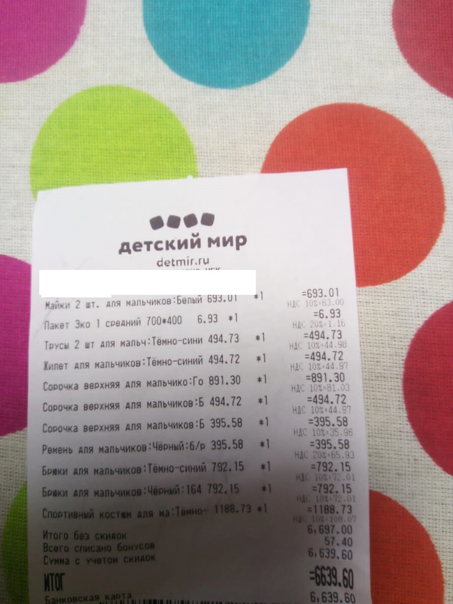 Все не было времени написать, во сколько мне обошлась покупка школьной формы для своего взрослого сына, который подрос за лето так, что все прошлогоднее ему стало мало, или выглядит так неопрятно, что стыдно одеть (по-крайней мере, мне). Форму покупала в "Детском мире". Все бюджетное, но в то же время достаточно качественное. Первый чек на сумму 6697 рублей (со скидкой - 6639,60 рублей) Все цены уже со скидкой по карте покупателя. 1) Пакет для покупок - очень уж дорогие стали пакеты в магазинах! 6,93 рубля 2) Майки 2 штуки белые для мальчика в упаковке 693,01 рубль. Качество - обалденное, очень хороший трикотаж, который не рвется (как бывает, у дешевого - после стирки остаются дырочки возле шва) 2) трусы 2 штуки для мальчика - боксеры - 494,73 рубля. Серые и темно-синие взяла 3) жилет темно-синий для мальчиков - 494,72 рубля. 4) сорочка голубая с узорчиком - взяла одну подороже - 891,30 рубля. 5) сорочка белая для мальчика с длинным рукавом - 494,72 рубля. 6) сорочка белая для мальчик