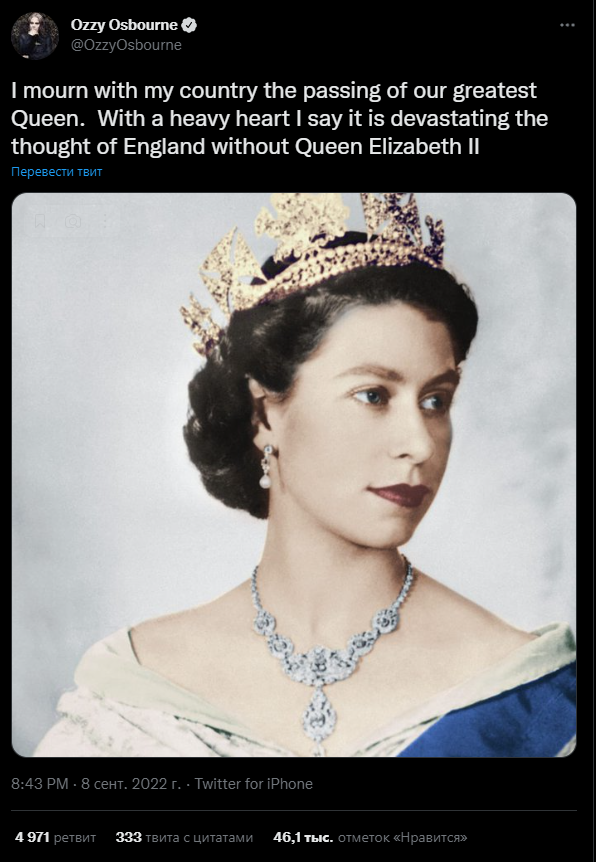 Вчерашняя новость, о смерти королевы Елизавета II потрясла весь мир. Рок музыканты по всему миру скорбят. Прошелся по Твиттеру, собрал реакции некоторых из них Журнал «Артист» в Телеграме – подписывайся! Релизы, новости и много еще интересного контента! Ждем тебя! Оззи Осборн Я скорблю вместе со своей страной о кончине нашей величайшей королевы. С тяжелым сердцем я говорю, что это опустошает мысль об Англии без королевы Елизаветы II Гизер Батлер, Black Sabbath Грустно слышать о кончине королевы. Я помню уличные торжества, когда она была коронована как королева. Всегда основной продукт взросления в Англии. GSTQ- RIP Шэрон Осборн Любовь и молитвы за нашу королеву The Rolling Stones The Rolling Stones выражают свои глубочайшие соболезнования королевской семье в связи со смертью Ее Величества королевы Елизаветы II, которая постоянно присутствовала в их жизни, как и в жизни многих других Мик Джаггер, The Rolling Stones Всю мою жизнь Ее Величество Королева Елизавета IIвсегда была рядом. В де