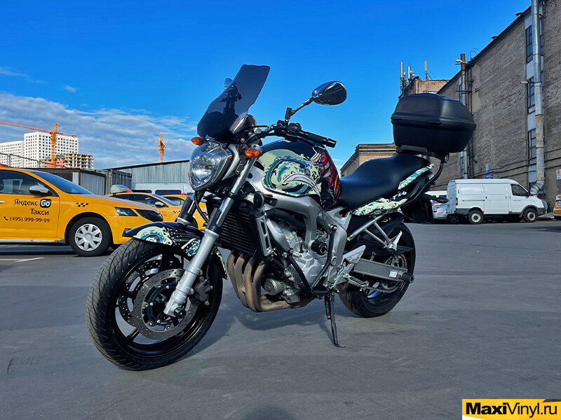 К нам обратился клиент с целью полной оклейки его мотоцикла винилографией. Нам была поставлена задача отобразить самурая выходящего из волн, причем и самурай и волны должны были быть определенные, изображения которых нам предоставил клиент. Что именно было оклеено: переднее крыло, бак, задний пластик и ручки на задней части мотоцикла. Если посмотреть на переднее крыло, то создается эффект того, как будто волны хлыщут по его бокам, что касается изображения самурая, то он был отмасштабирован таким образом, чтобы его размер был максимально возможным, но при этом чтобы смог уместиться его меч, что касается заднего пластика, то он был оклеен таким образом, чтобы мы смогли уместить заводские наклейки (хотелось бы отметить, что наклейки на баке в виде табличек, логотипы Yamaha и буквы FZ6 нами были изготовлены заново). Выполнено: