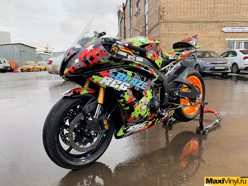 К нам обратился мотогонщик Александр Блазуцкий с целью создания дизайна и оклейки мотоцикла под цвет его гоночного комбинезона. Путем длительного согласования макета, мы пришли к тому, что будем использовать камуфляж с использованием звезд, причем стоит отметить, что звезды тут и напечатанные и наклеенные сверху из радужного хрома. Что касается сложностей по оклейке данного мотоцикла – это было то, что на мотоцикле установлен спортивный пластик, который имеет множество недостатков на своей поверхности, в частности острые края, которые приходилось постоянно обходить при подрезе пленки. На наш взгляд, мотоцикл получился очень ярким и запоминающимся – как того и хотел владелец. Выполнено: