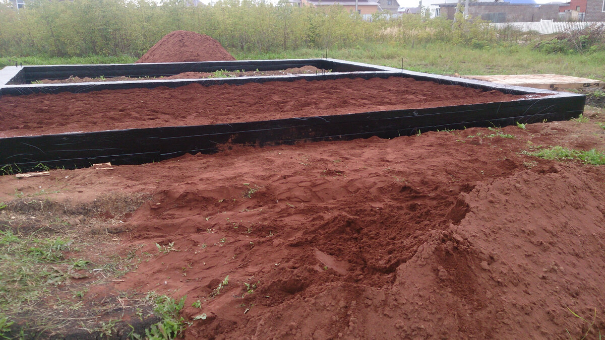 Фундамент высох. Сделал гидро изоляцию, помазал битумной мастикой. И сделал обратную засыпку песком.