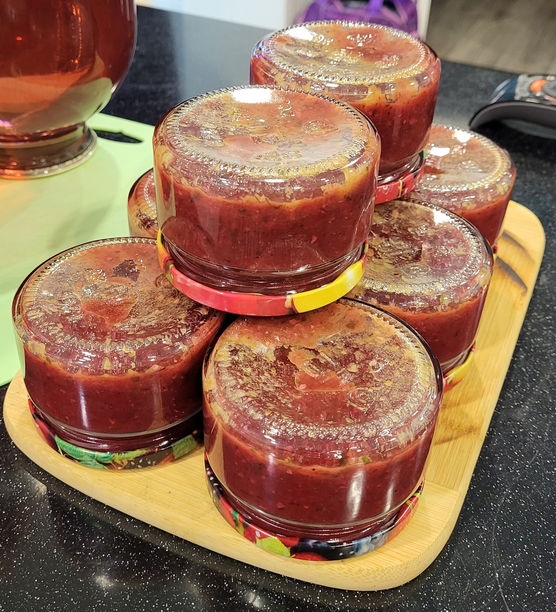 Давно хотела сделать что-нибудь остренькое. Мои родные очень любят такой соус к мясным или рыбным блюдам. Итак, что нам потребуется? 2 кг слив (я брала черносливы) перец Чили - 2 шт чеснок - 2 головки соль - 2,5 ст л сухая зелень: кинза, семена кориандра свежая зелень: укроп, базилик Сливу отделяем от косточек, нальем воды так, чтобы только скрыло сливы и ставим на огонь. Как закипит, выключаем, воду сливаем (потом из нее можно сделать компот) и даем сливам полностью остыть. Затем охлажденную пробиваем блендером или пропускаем через мясорубку, у кого что есть. Добавляем чеснок, перец, соль, специи и травы. Все перемешать и проварить 7-8 минут. Разлить по маленьким стерилизованным баночкам, укрыть, дождаться полного остывания и храним в холодильнике. Приятного аппетита!