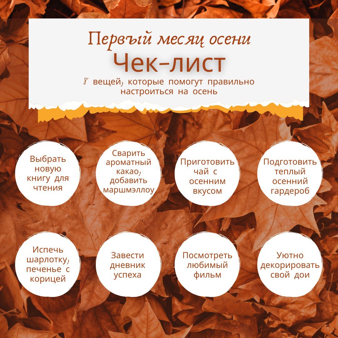 Вот и наступила осень - чудесная пора, которая сама по себе мотивирует ею наслаждаться ☀️🍁 Мы вместе с членами Управляющего совета подготовили для вас осенний чек-лист 📝 Пусть эта осень будет прекрасным для вас временем ✨🍂 🔥Напишите с помощью эмодзи 😊 в комментариях что вас вдохновляет 🥰 ⬇️⬇️⬇️ #ДОНМ #шик16 #НашУправляющийСовет #УСШик